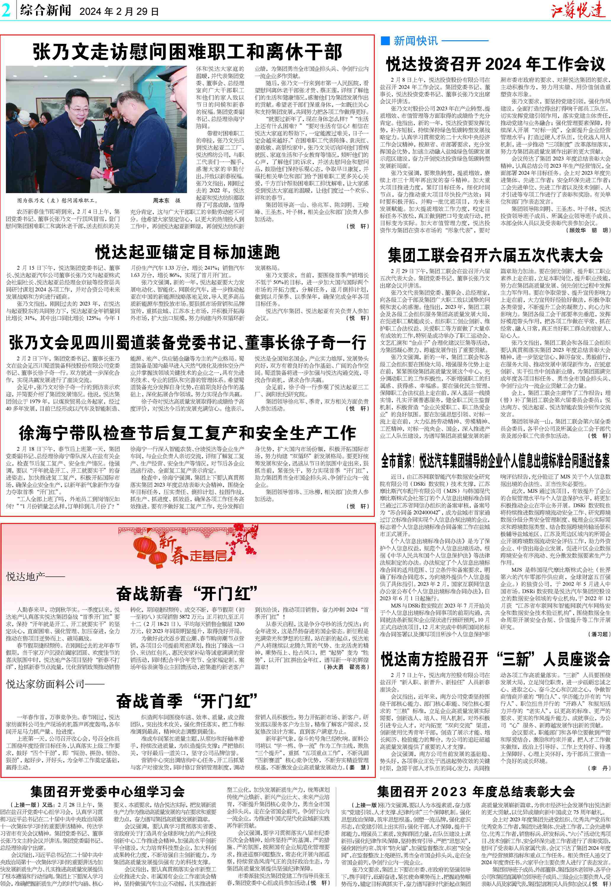 2月17日(农历大年初一)上午,集团党委书记、董事长张乃文看望慰问部分在盐企业一线员工,视频连线海内外部分所属企业干部职工,代表集团党委、董事会、总经理室向春节期间坚守岗位的劳动者致以节日问候和新春祝福。张乃文首先来到悦达仁逸康养中心,与入住老人和一线工作人员亲切交谈,并送上节日慰问品。他详细询问了节日期间安全管理、服务保障和老人生活照料等情况,对大家坚守服务岗位的奉献精神给予高度评价。他强调,要用心用情做好康养服务,不断提升服务质量和专业水平,努力打造让老人安心、子女放心、社会满意的康 ...